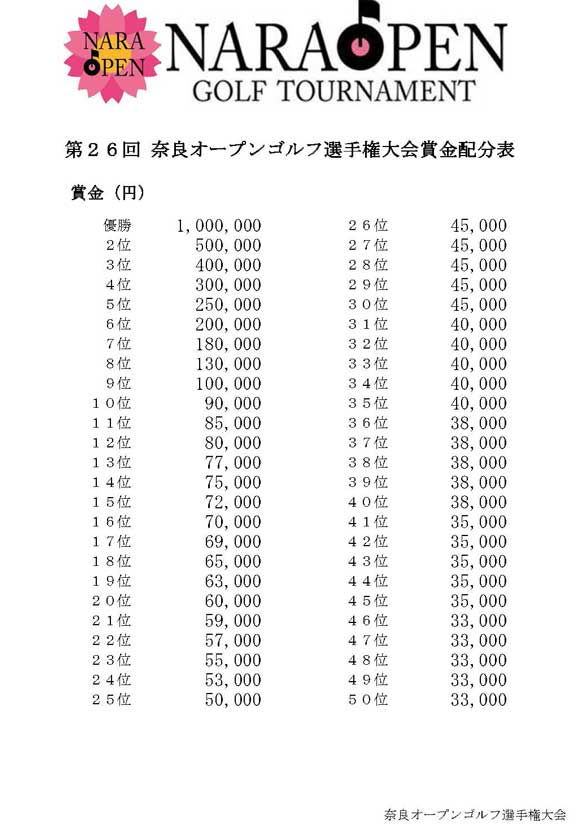 本大会の賞金配分表は下記記載いたします。